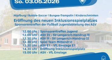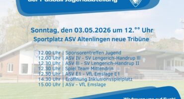Read more +14 April 2026 By Team Jugend in Fussball, Fussball JugendAm Sonntag, den 03.05.2026 findet der diesjährige Familientag des ASV Altenlingen am heimischen Wallkamp statt. Los geht es schon um 12.°° Uhr. Neben spannenden Fußballspielen der Ersten, Dritten und Vierten Mannschaft sowie des Team Mittendrin steht auch ein Spiel der E1 des ASV Altenlingen gegen die E1 des VfL Emslage im Rahmen des Sponsorentreffens der