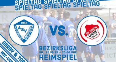 Read more +22 September 2025 By ASV Altenlingen in Fussball, Fussball HerrenDonnerstag ist Crunchtime: Der ASV und ganz besonders unsere Erste brennen auf das „kleine“ Derby und Flutlicht-Heimspiel gegen Aufstiegsfavorit Union Lohne. Anstoß ist um 20 Uhr. Es ist das Duell des Vizemeisters gegen unseren ASV, der im Vorjahr phänomenal den vierten Tabellenplatz erreichen konnte. Auch in dieser Spielzeit kamen beide Teams gut aus den Startlöcher: