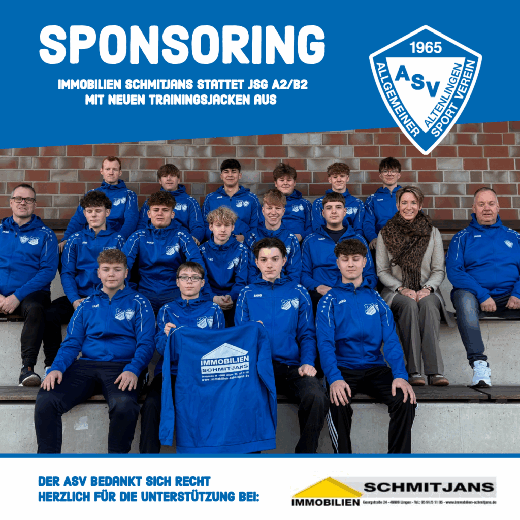 Ein herzliches Dankeschön möchten wir heute an Immobilien Schmidtjans aus Lingen für das großzügige Sponsoring für die Fußball Jugendabteilung des ASV Altenlingen aussprechen. Kurz vor Weihnachten durften sich die Spieler der A2/B2 der JSG ASV Altenlingen/SV Holthausen-Biene über neue Trainingsjacken freuen.