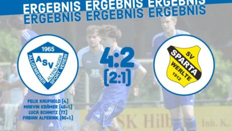 Am Donnerstagabend feiert die Erste einen 4:2-Heimsieg gegen Aufsteiger Sparta Werlte. Trotz doppelter Führung lässt der ASV den Gegner gleich zweimal wieder ausgleichen, bevor Luca Schmitz und Fabian Alferink in der Schlussviertelstunde für die Entscheidung zugunsten von Blau-Weiß sorgen. Insgesamt ein eher durchschnittlicher Auftritt, bei dem am Ende aber nur die drei Punkte und die Eroberung vom dritten Tabellenplatz zählen.