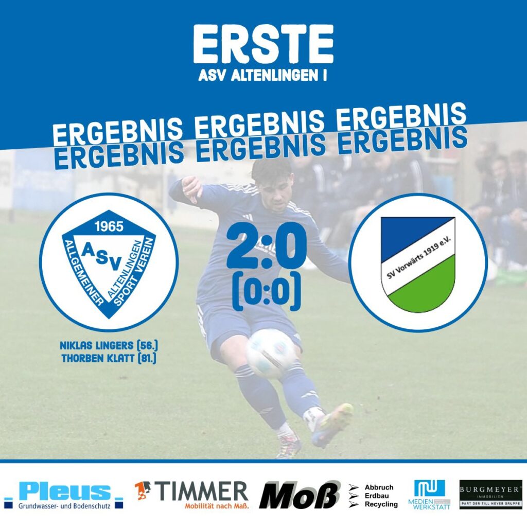 Die Erste liefert beim 2:0-Heimsieg gegen Vorwärts Nordhorn eine reife Leistung ab und erobert zumindest für eine Nacht die Bezirksliga-Tabellenführung. Auch wenn Lohne am nächsten Tag wieder am ASV vorbeiziehen konnte: Zurzeit spielt unsere Erste richtig stark auf und scheint vor allem auch defensiv stabiler geworden zu sein. Vorne hingegen geht sowieso immer etwas – die beiden Traumtore von Niklas Lingers und Thorben Klatt per Freistoß stellen das eindrucksvoll unter Beweis.