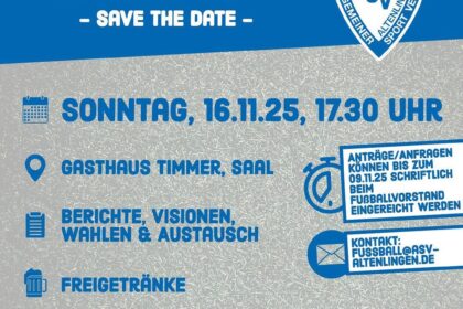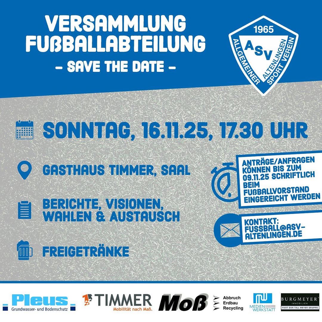 Save the Date: Die Abteilungsversammlung der Fußballer für die Saison 2025/2026 findet in diesem Jahr am Sonntag, den 16. November um 17.30 Uhr im Saal des Gasthauses Timmer statt. Vorher ist nur die Erste um 14 Uhr auswärts in Bad Bentheim im Einsatz. Alle anderen ASV-Teams sind entweder spielfrei oder befinden sich bereits in der Winterpause.