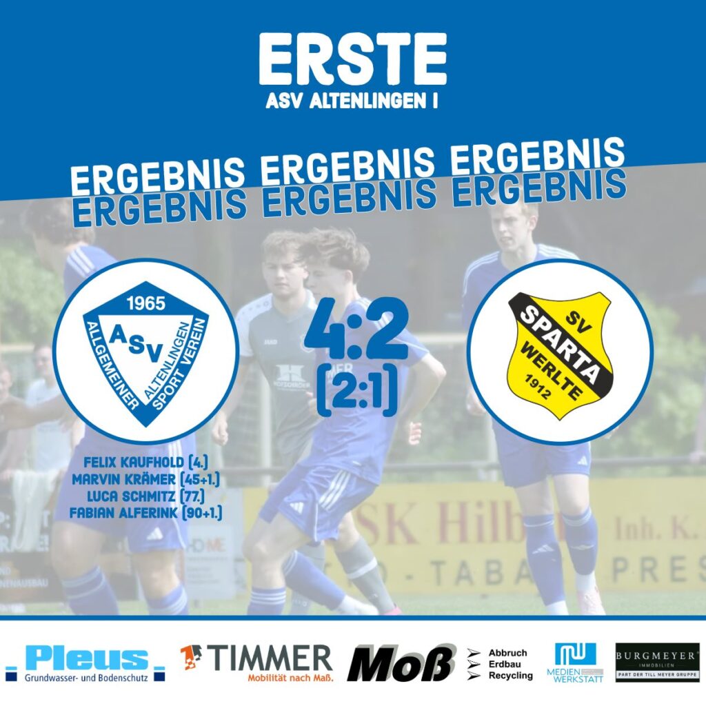 Am Donnerstagabend feiert die Erste einen 4:2-Heimsieg gegen Aufsteiger Sparta Werlte. Trotz doppelter Führung lässt der ASV den Gegner gleich zweimal wieder ausgleichen, bevor Luca Schmitz und Fabian Alferink in der Schlussviertelstunde für die Entscheidung zugunsten von Blau-Weiß sorgen. Insgesamt ein eher durchschnittlicher Auftritt, bei dem am Ende aber nur die drei Punkte und die Eroberung vom dritten Tabellenplatz zählen.
